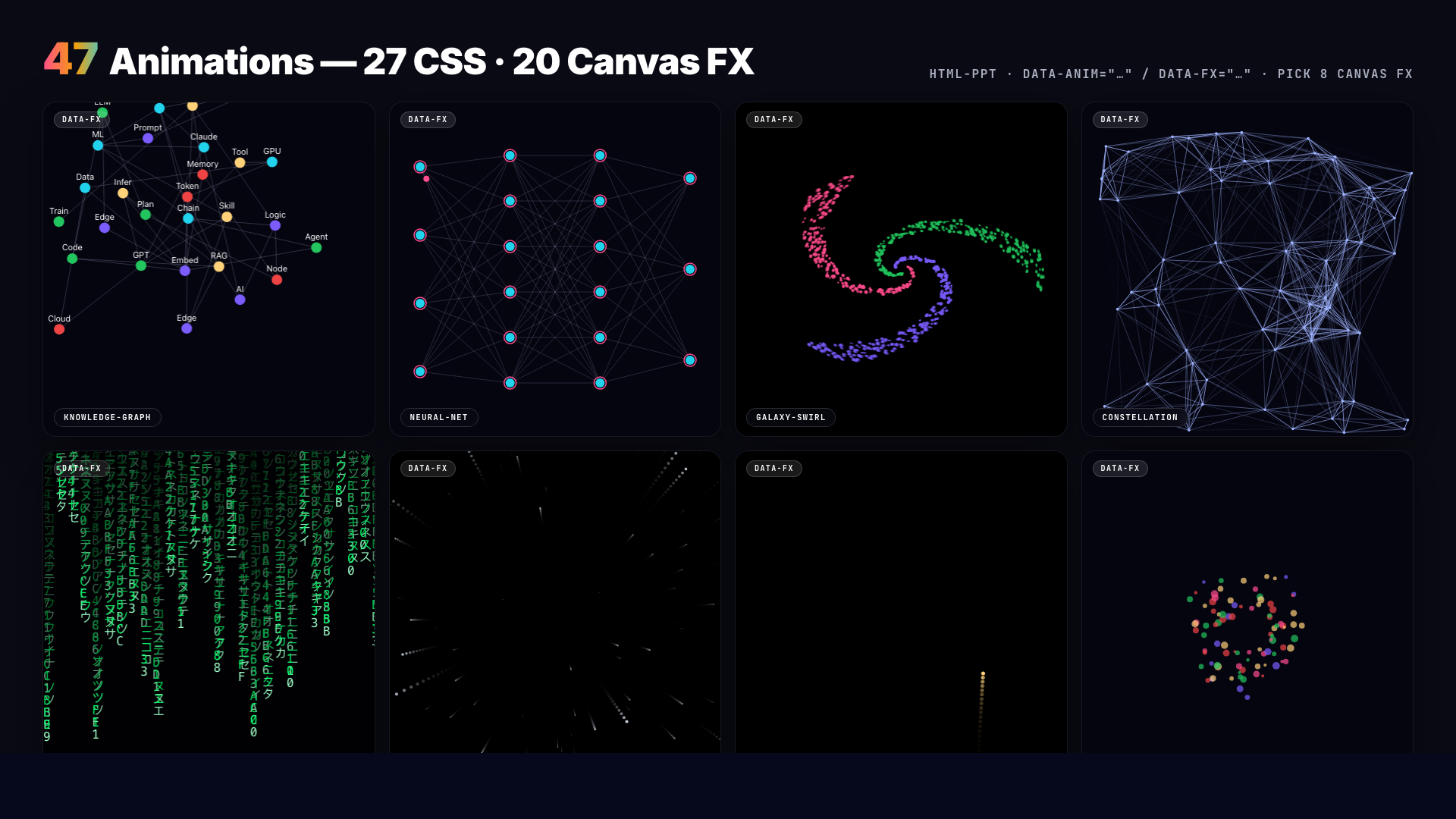 27 CSS animations + 20 Canvas FX