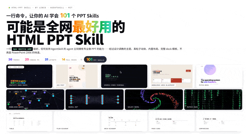 A world-class AgentSkill for producing professional HTML presentations in 36 themes, 14 full-deck templates, 31 page layouts, and 47 animations (27 CSS + 20 canvas FX) — all pure static HTML/CSS/JS, no build step.